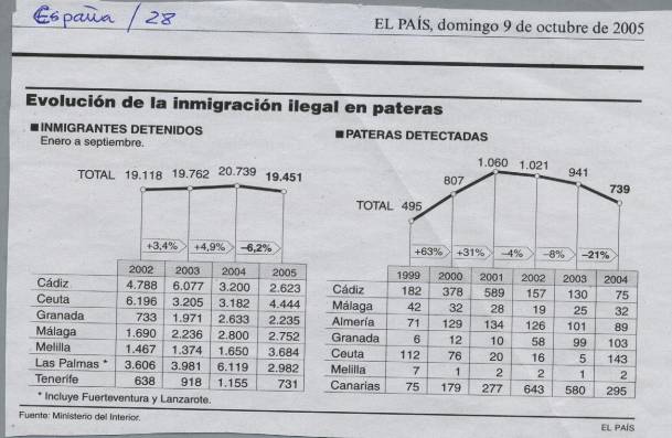 9 Oct. Pág 28: Gráfico: “Evolución de la inmigración ilegal en pateras”